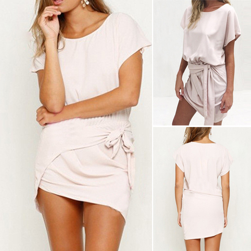 Boasting a sweet pink color,with short sleeve,round neck and irregular hem design,this dress can give