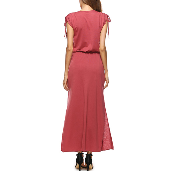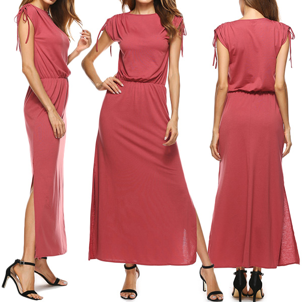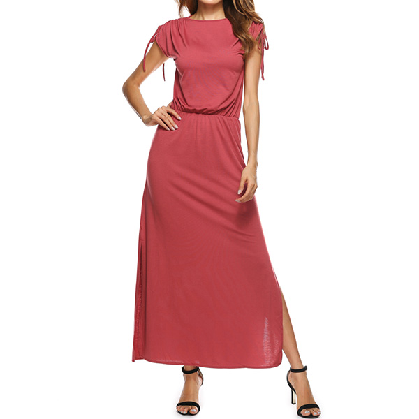 Solid color style,designed with short sleeve,round neck,slit hem and an elastic waist,elegant and refined.