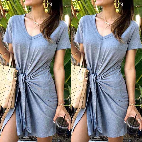 in a solid color,with short sleeve,v-neck and front-knotted design,chic yet distinctive. Meanwhile,