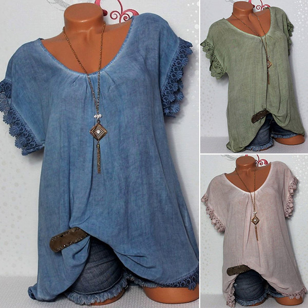 This t-shirt comes with a solid color,the v-neck and lace spliced design will lend you a dash of sexy and feminine flavor,while the soft,breathable fabric can promise you a comfortable day. Try to match with your shorts to greet the summer season!