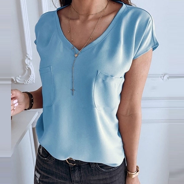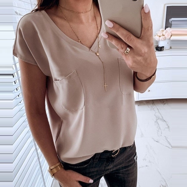 v-neck and chest patch pockets,this piece can ensure you a cool and comfortable day with