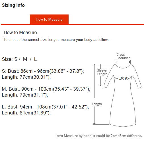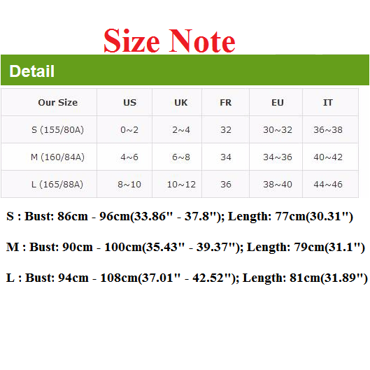 S : Bust : 86cm - 96cm(33.86" - 37.8"); Length : 77cm(30.31");