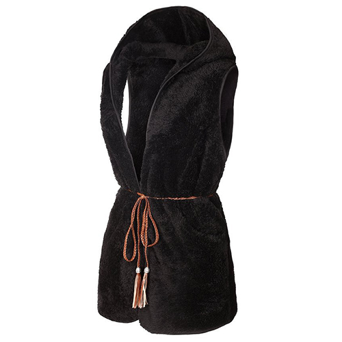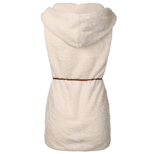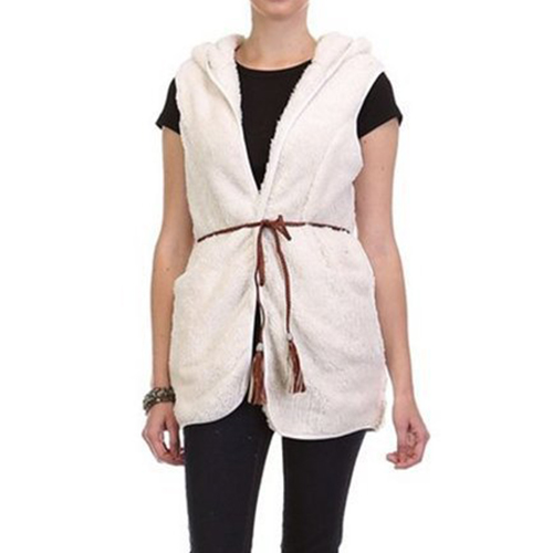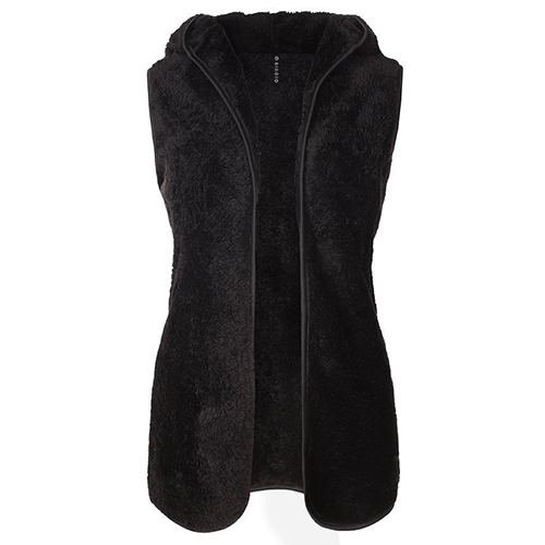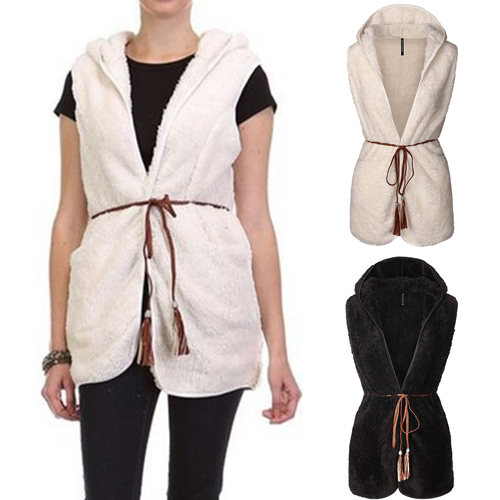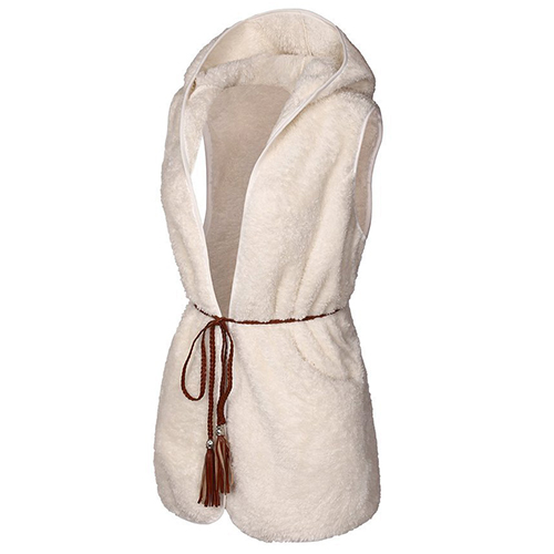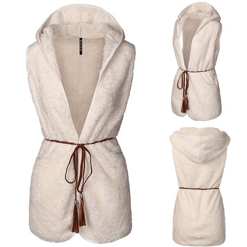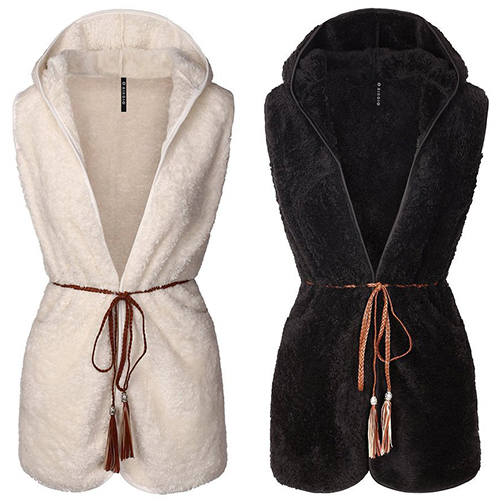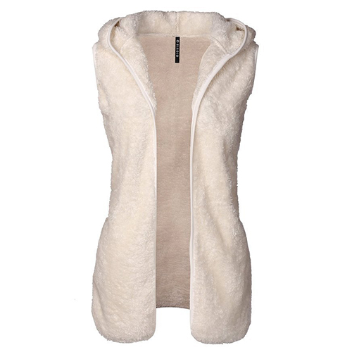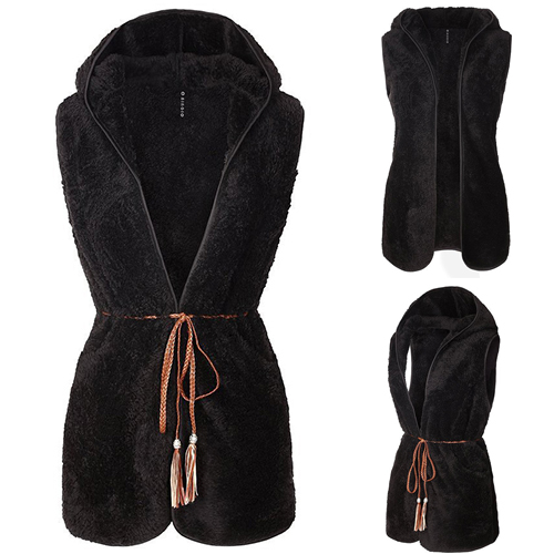 Crafted from sleek and warm fuzzy material, ,with solid color, sleeveless and hooded design, this vest would