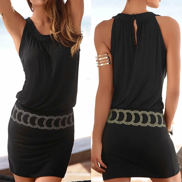 It is deisgned with sleeveless,round neck and an elastic waist,this dress is sure to offer you a