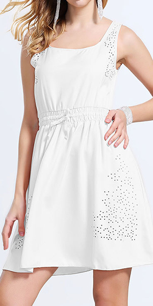 with sleeveless,round neck,hollow out and gathered waist design,delicate and stylish. Dress it up