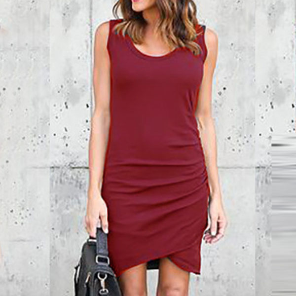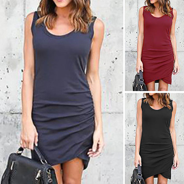 For example this dress. Solid color style,designed with sleeveless,round neck,an irregular hem and a fit silhouette,