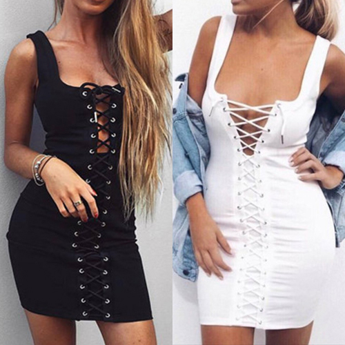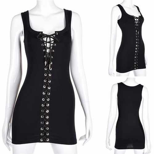 outfitted with sleeveless,round neck and a body-flattering silhouette,sexy and sultry. Its lace-up details at front