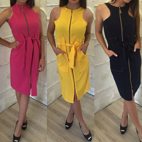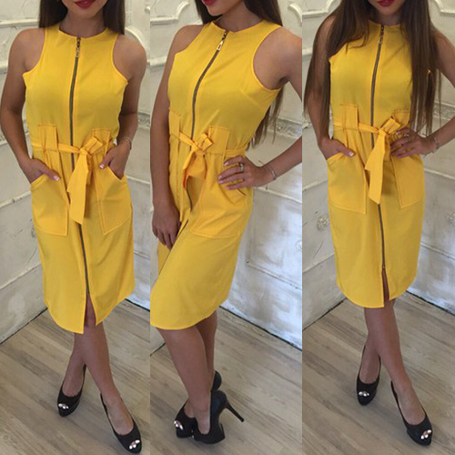Solid color style,designed with sleeveless,round neck,lace-up design at waist part and zipper closure