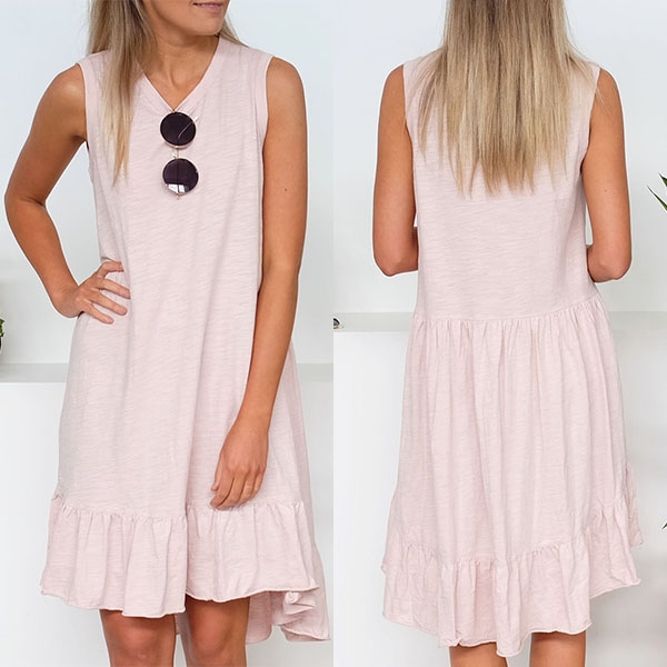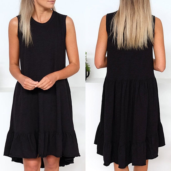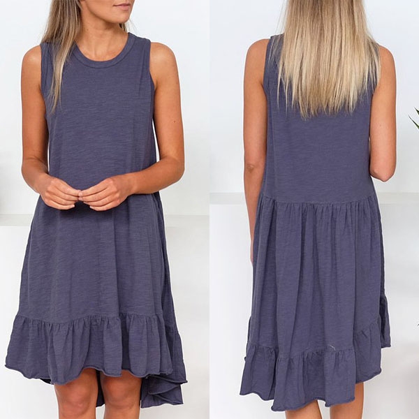 Boasts a solid color,finished with sleeveless,round neck,ruffle hem and a loose silhouette,this dress