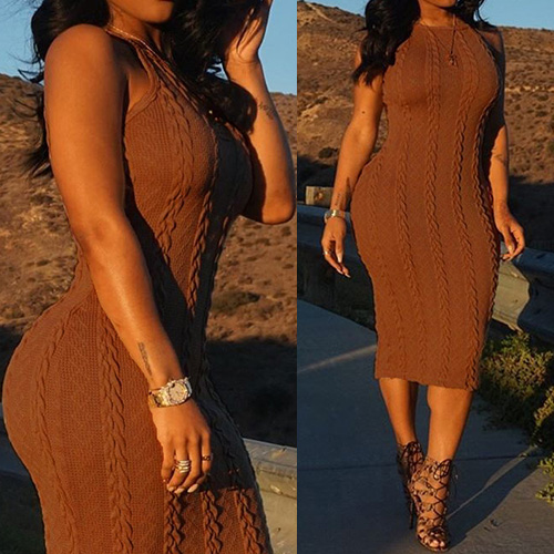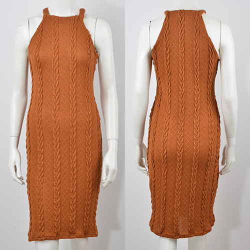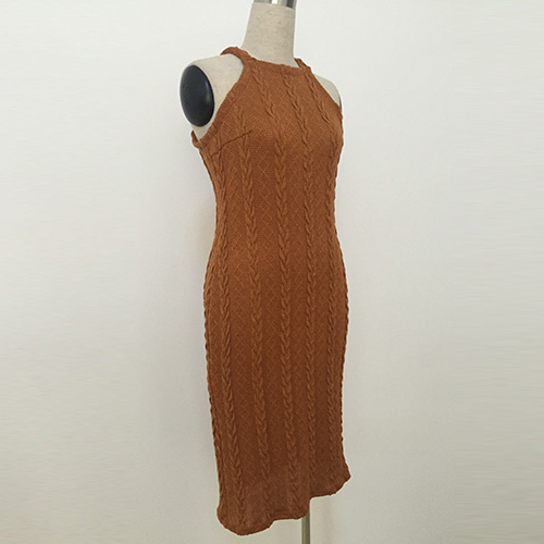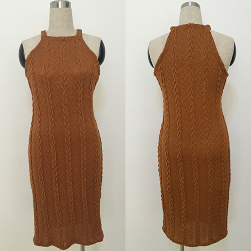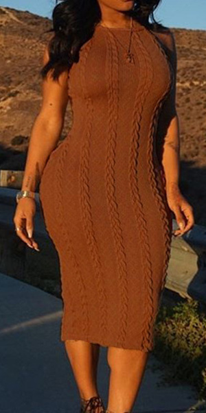 This sweater dress features solid color style,with sleeveless,round neckline,a mid length and