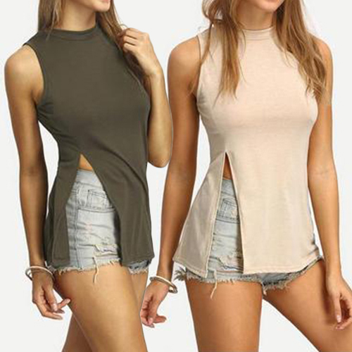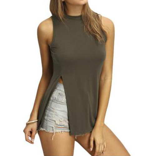 Fashion Solid Color Sleeveless Round Neck Slit Hem T-shirt