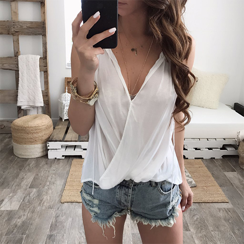 Outfitted with sleeveless,v-neck and a high-low hem,this top can give you many differnet matching styles by