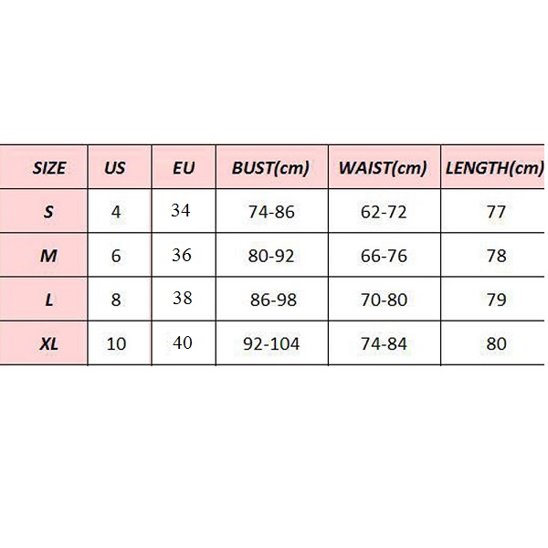 XL : Bust : 92cm - 104cm(36.22" - 40.94"); Waist : 74cm - 84cm(29.13" - 33.07"); Length : 80cm(31.5");