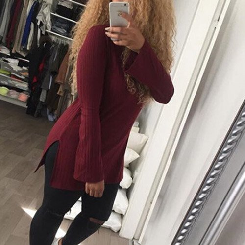 It features solid color style,its turtleneck and slit design makes it look so unique.