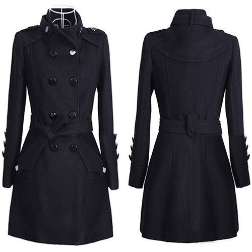 Double-breasted construction is paired with stand collar, long sleeve and 2 side pockets design,