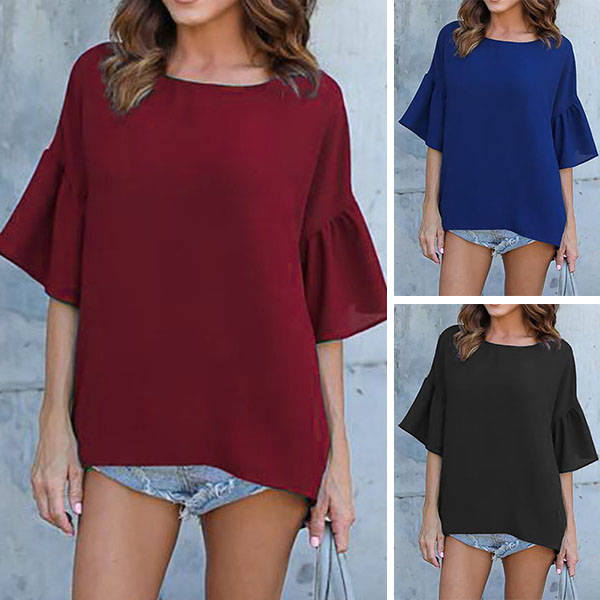 finished with trumpet sleeve,round neck,a high-low hem and a loose silhouette,this chiffon top can keep you cozy