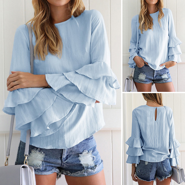 fabric,this top of course can ensure you a comfortable day. The design highlight? Of course its trumpet sleeve design.