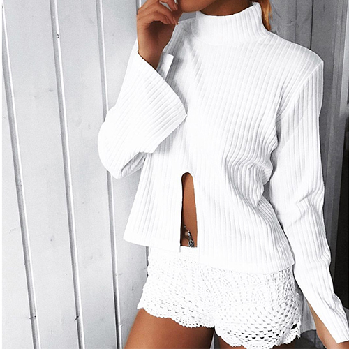 such as trumpet sleeve,turtleneck and slit hem make this piece so appealing. Paired with your