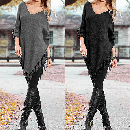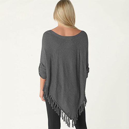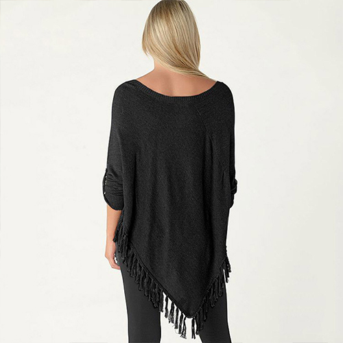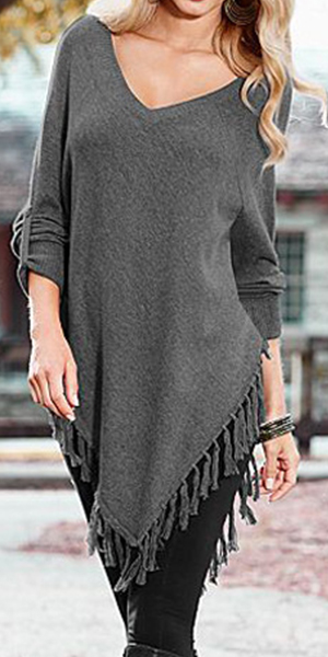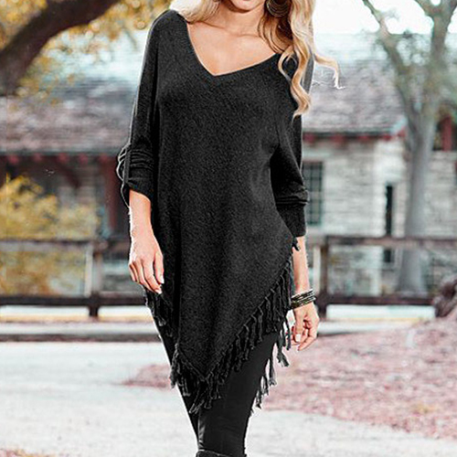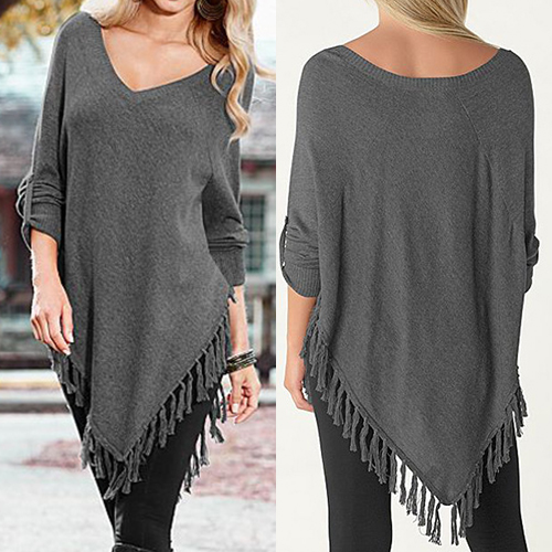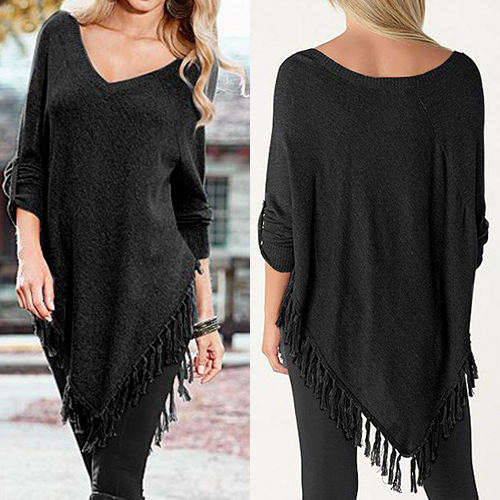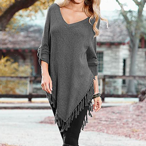 Outfitted with v-neck, button-tab sleeve and irregular tassel hem, this T-shirt is designed to give you