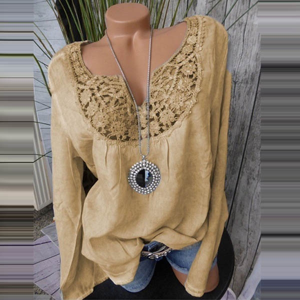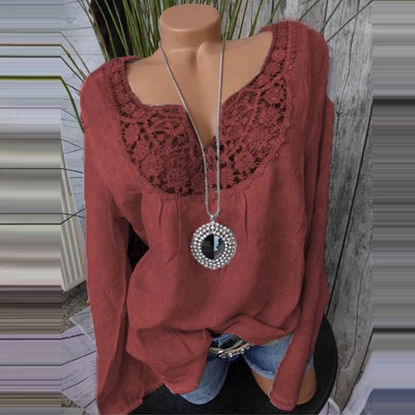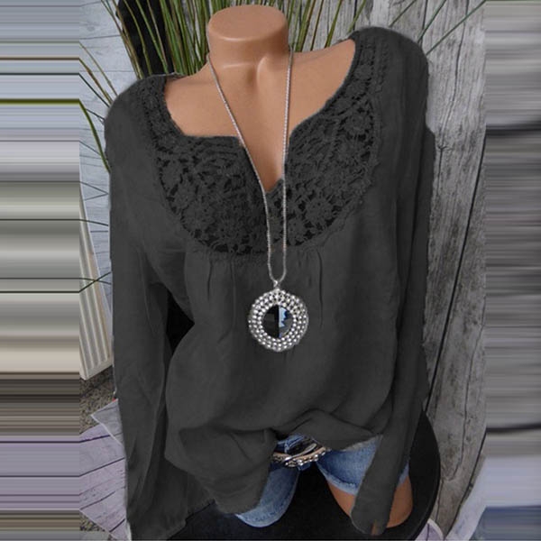 Exude confidence when you express your chic side in this lace spliced long sleeve top! Cut from a smooth
