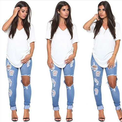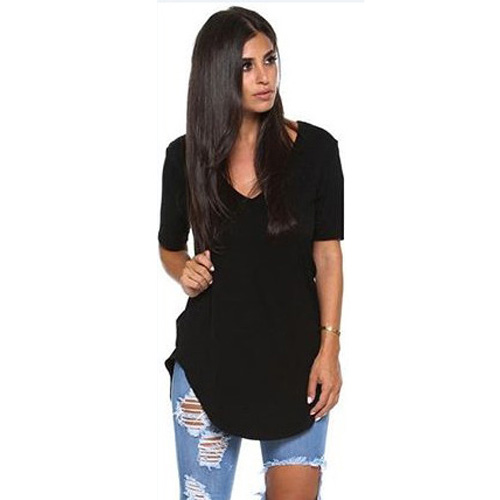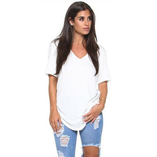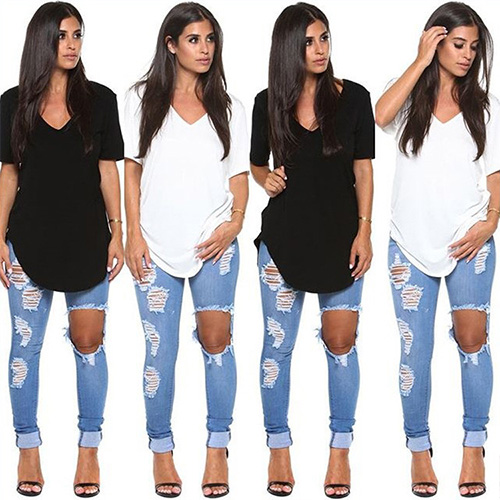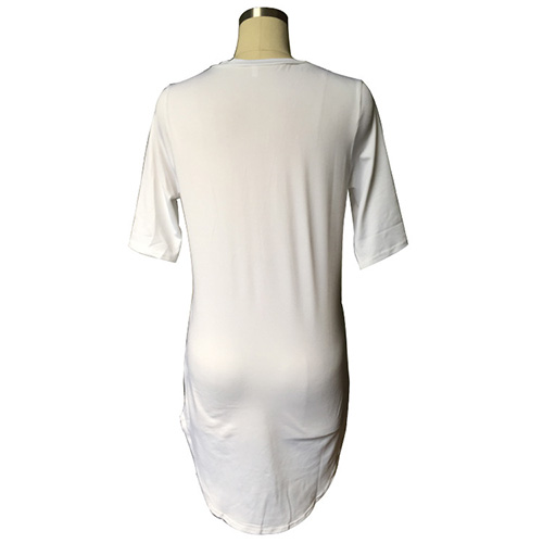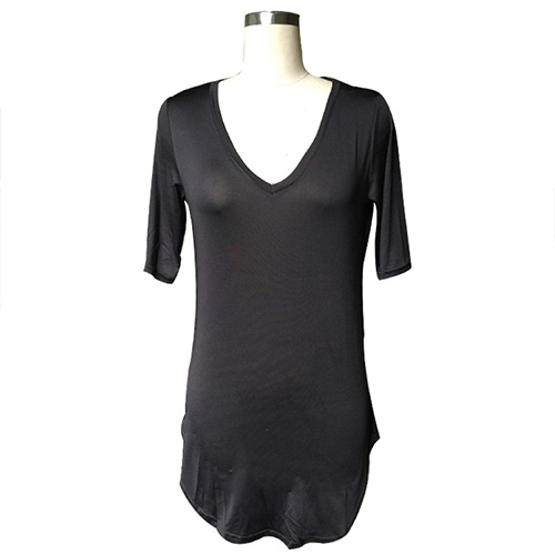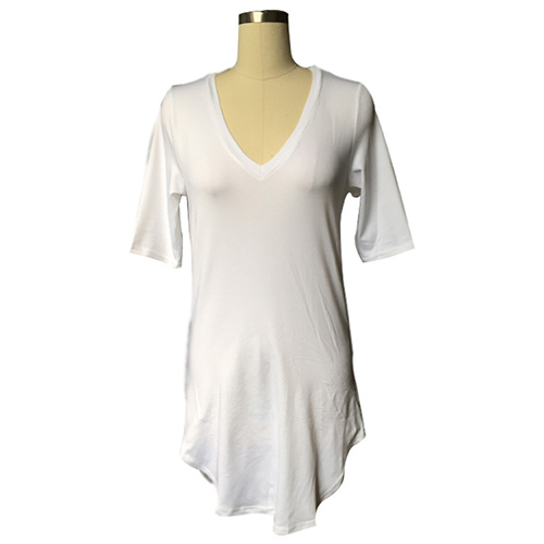 This short sleeve t-shirt dress is outfitted with a v-neckline and an irregular hem,chic and stylish.