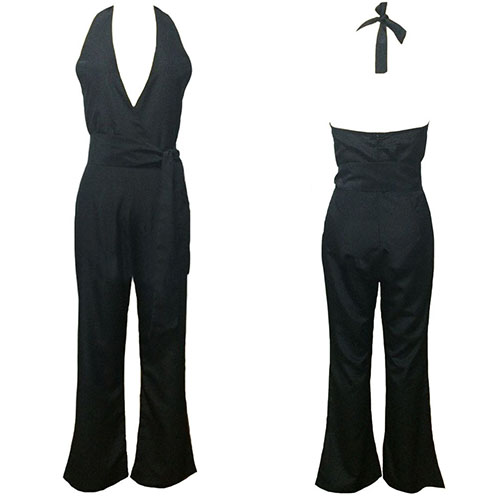 sleeveless and halter, chic and distinctive. And its wide trouser legs and gathered waist design make