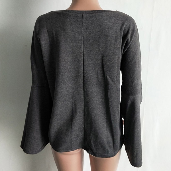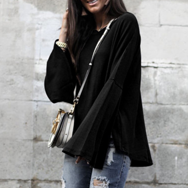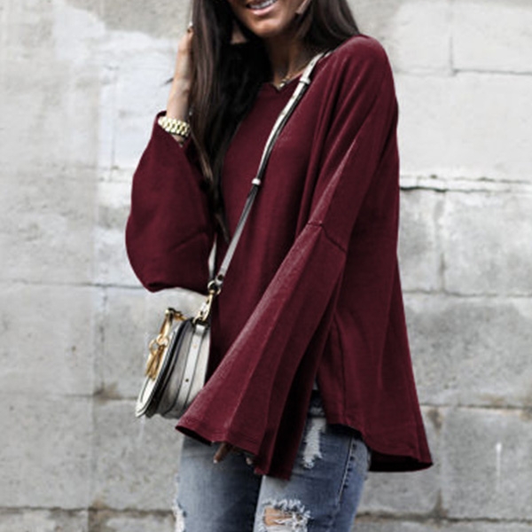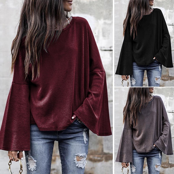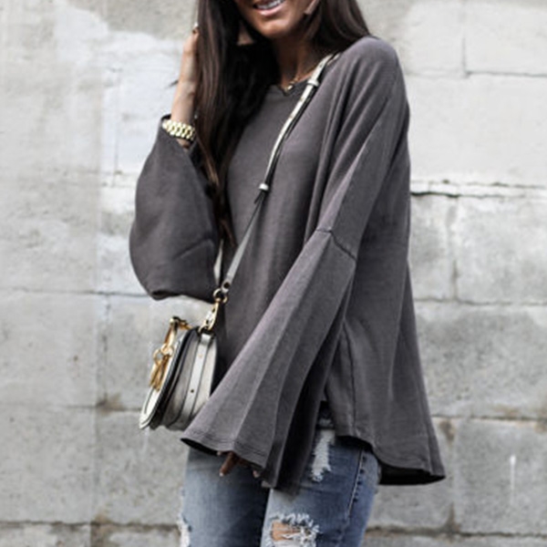 Hey,girls,you can slip into this t-shirt to boost your style. It is finished with solid color,trumpet sleeve,