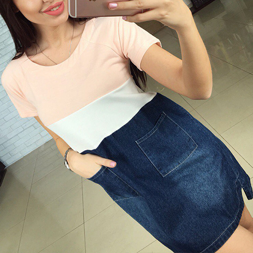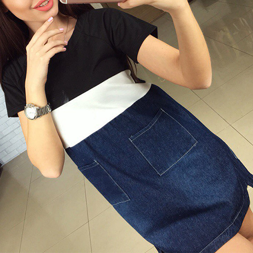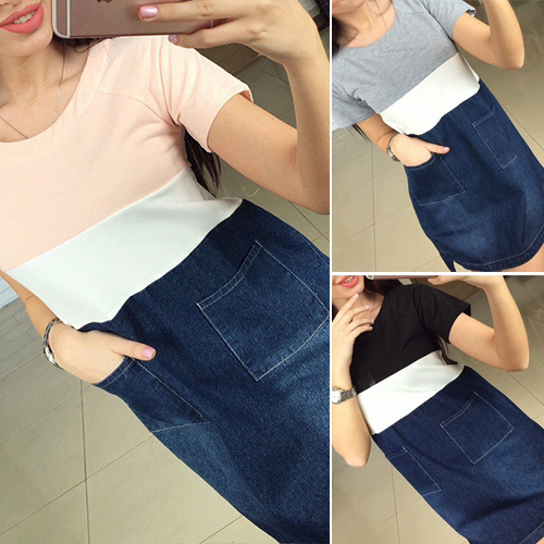 This dress features unique design. It is outfitted with spliced denim design and round neck