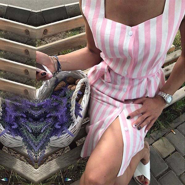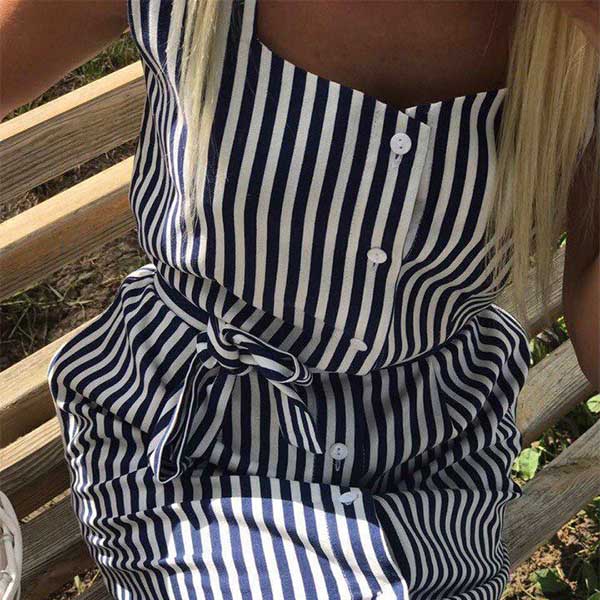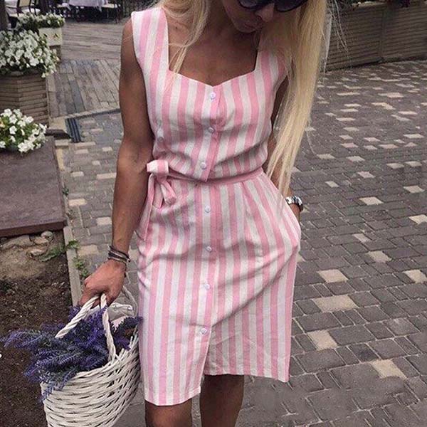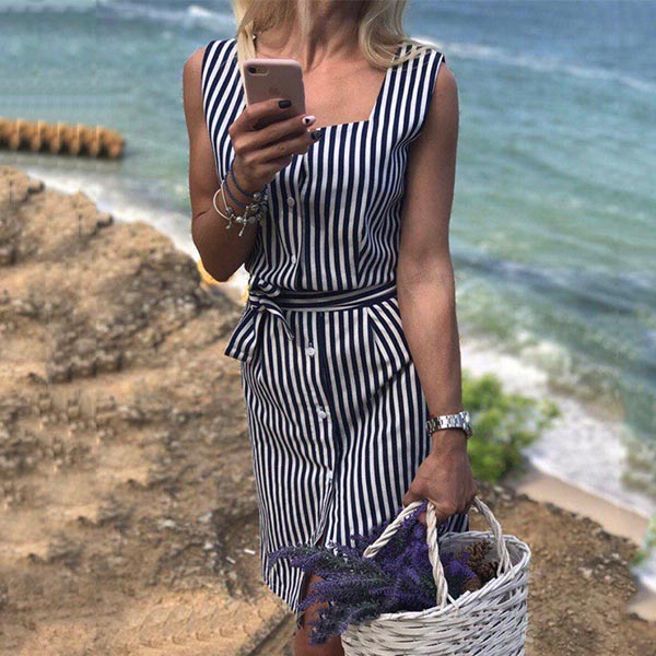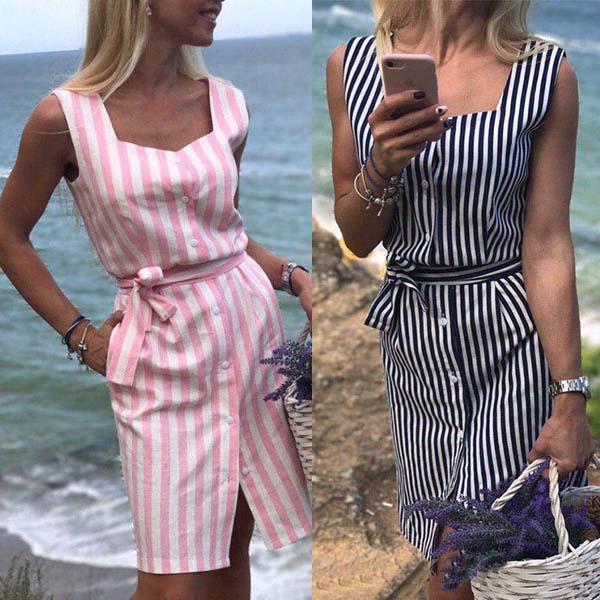 square neck ,single-breasted stlye,sleeveless and a tie belt at the waist.Striped design that can