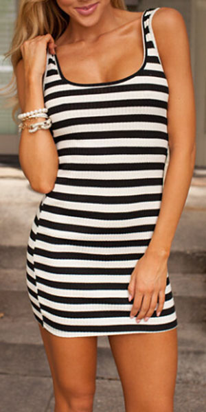 Take in a simple, chic look with this mini dress. It features strip print, U neckline and