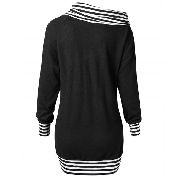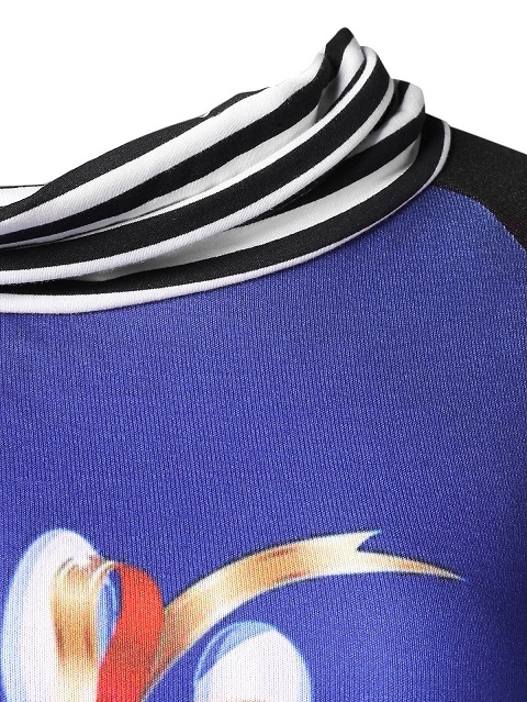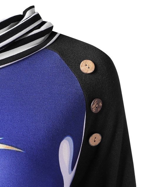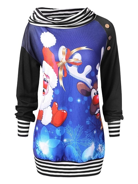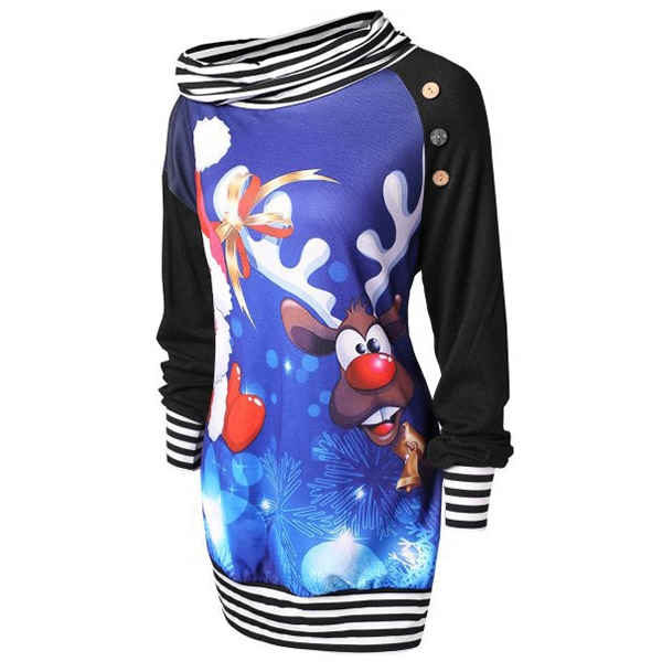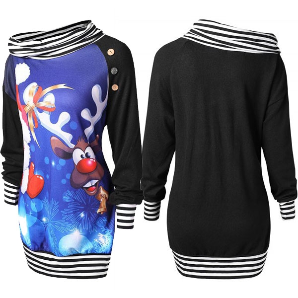 The striped spliced element,cowl neck and elk printed pattern design make this piece look so eye-catching