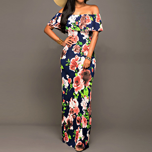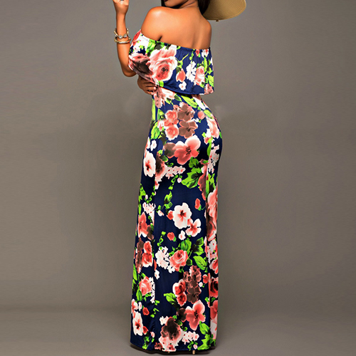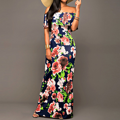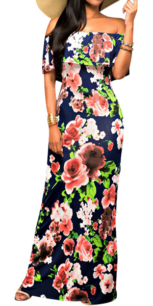 Pretty and exaggerating printed design makes this dress look distinctive. Designed with off shoulder, backless, ruffle and floor-length,