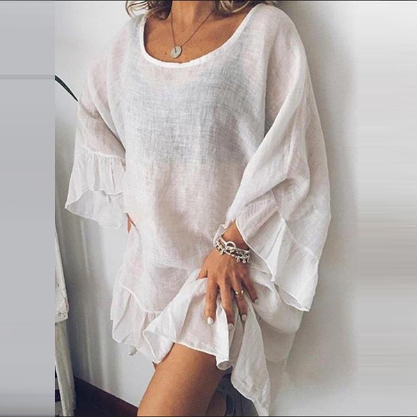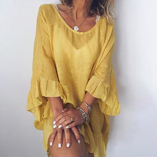 For a simple and relaxed style,you can just count on this dress. It boasts a solid color,its trumpet sleeve,