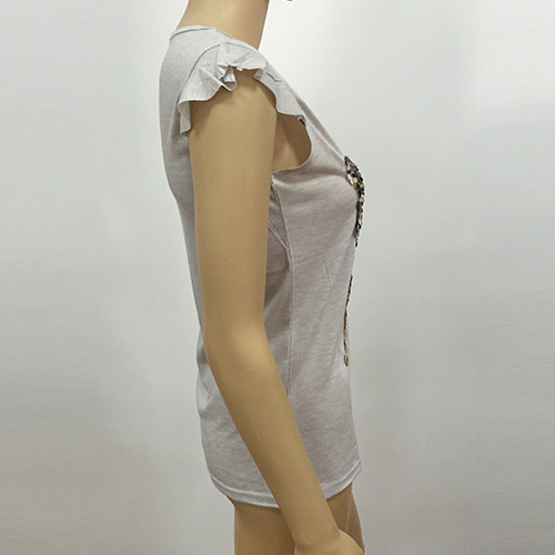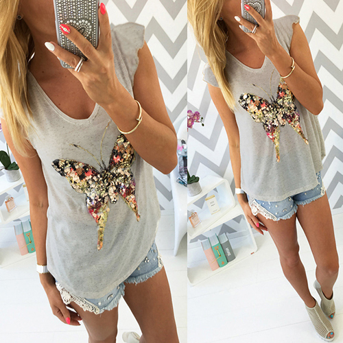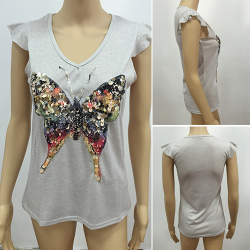 Wow, What a beautiful butterfly! This T-shirt with v-neck, cap sleeve and butterfly sequin design, eye-catching and trendy.