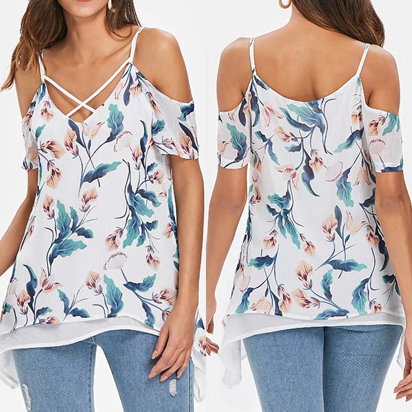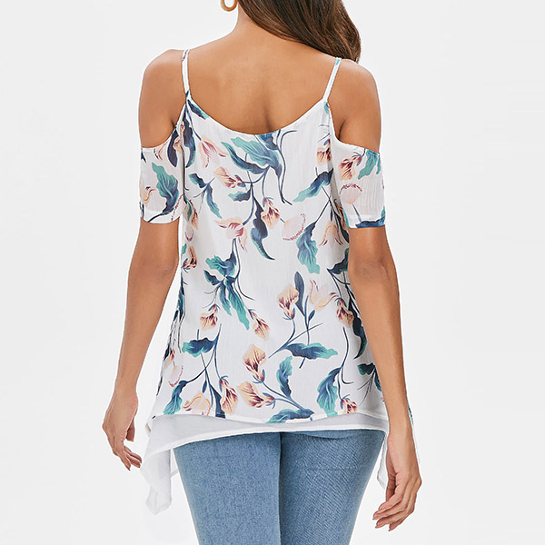 shoulder strap, irregular hem, open shoulder, short sleeve. Slip into fashionable jeans and strappy