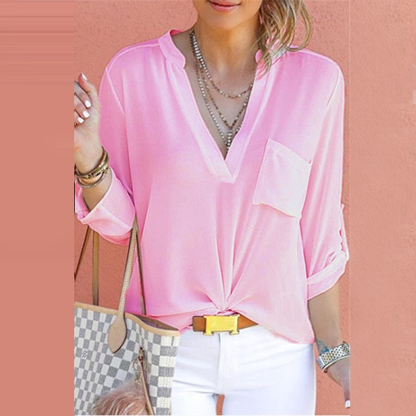feature a split V-neckline, front chest patch pocket, roll-tab sleeves, come with solid color design style, tuck it into