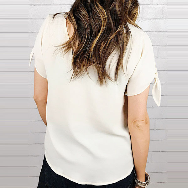 example.Solid color style,crafted from soft and breathable fabric,with short sleeve,v-neck and a bowknot