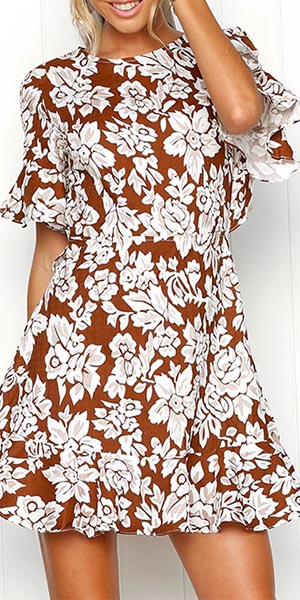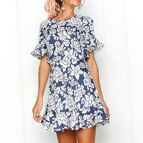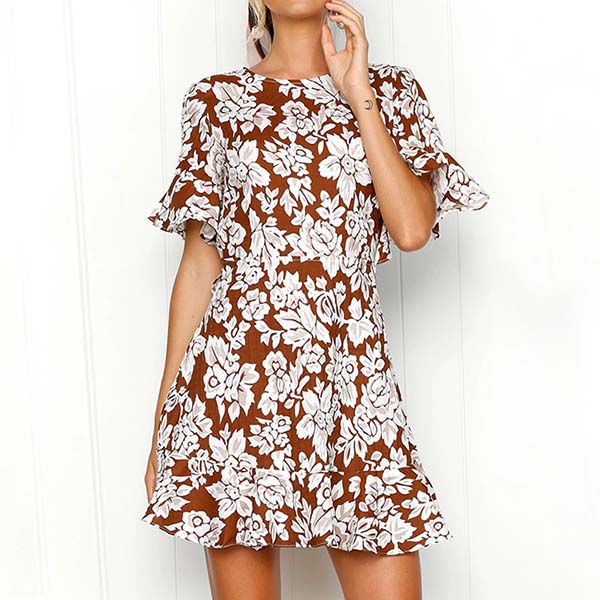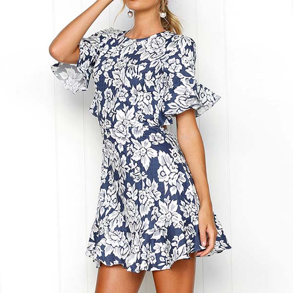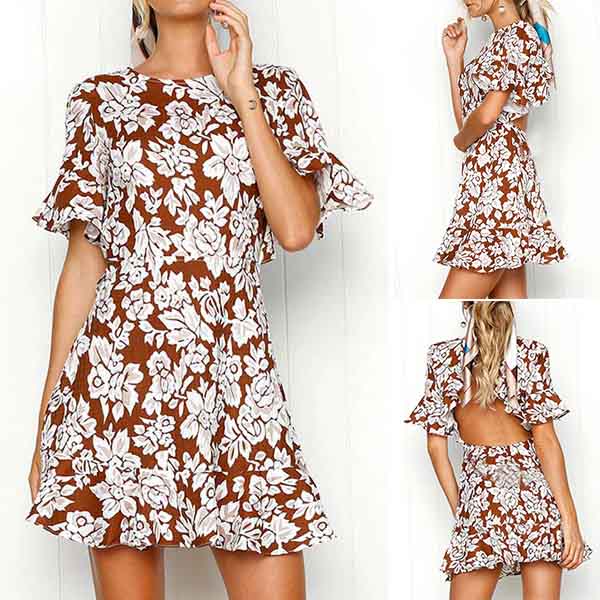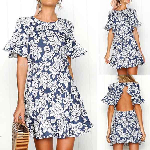Fashoin Round Neck Backless Ruffle-Trim Short Sleeve Floral Dress
