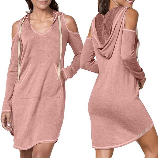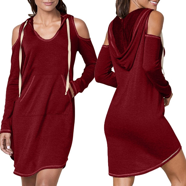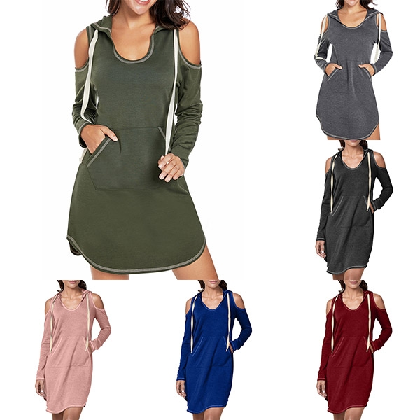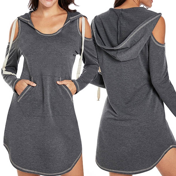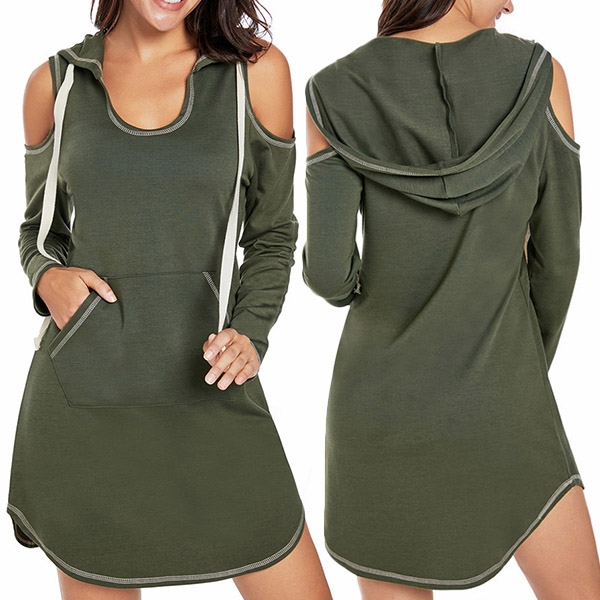 Hoodie Style Solid Color U-neck Open Shoulder Drawstring Hooded Shift Dress