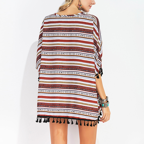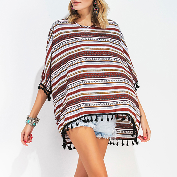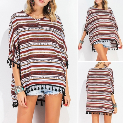 with stripe, which features the tops with strong layering feelings. The hem is adorned with beautiful tassels,