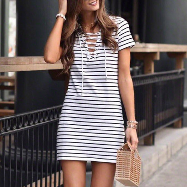 Look fashionably chic during the weekends with this dress. Striped style,designed with cap sleeves,little v-neckline with lace-up design and crafted from comfortable fabric,this dress lends you a sense of simple style to your summer wardrobe.