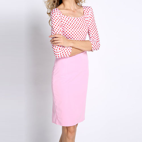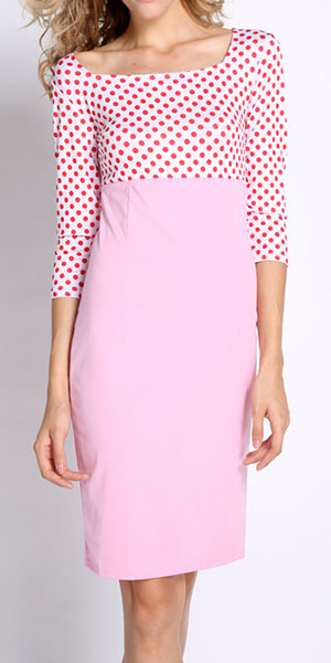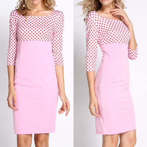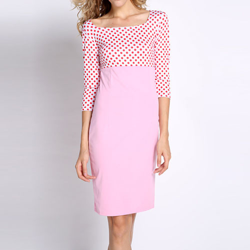 Dots printed spliced style,outfitted with 3/4 sleeve,square collar and a fit silhouette,this