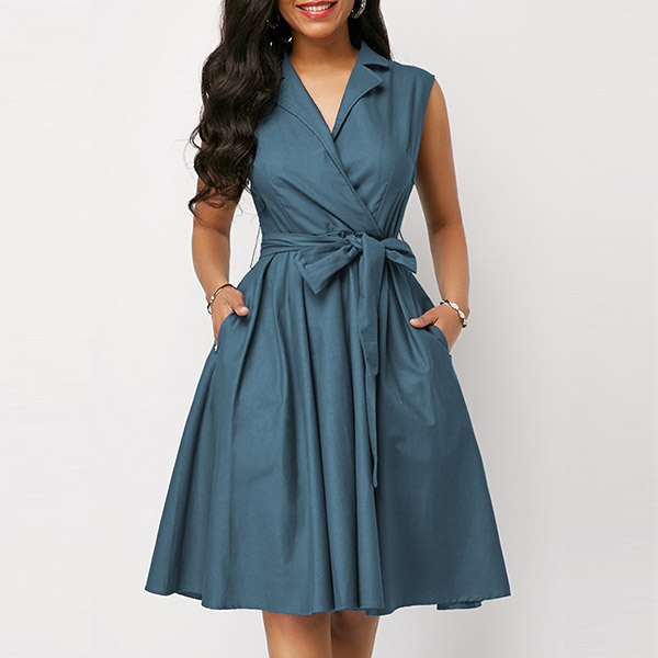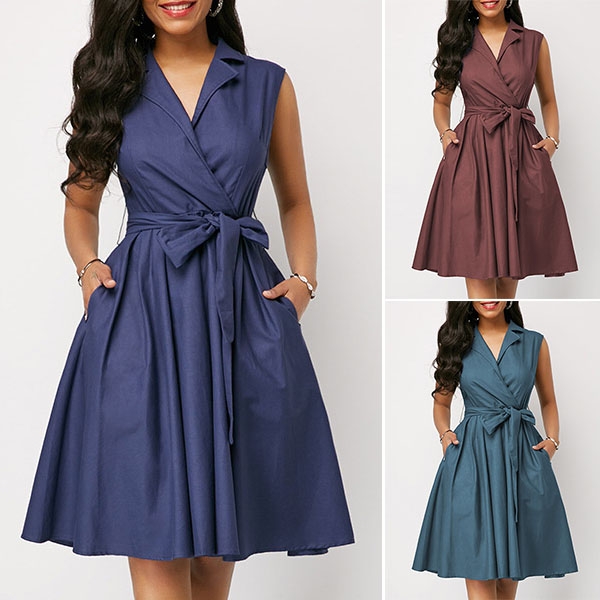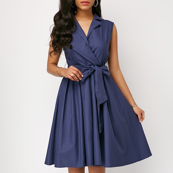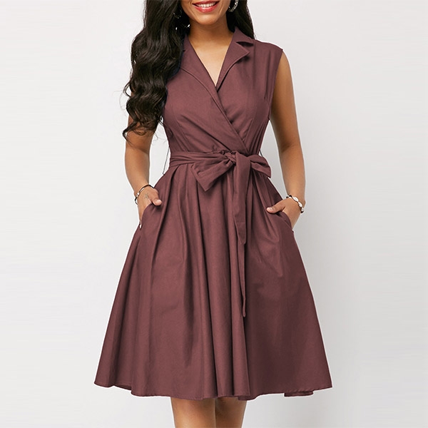 at this dress? It comes with a solid color,delicate yet elegant. Finished with sleeveless and notched lapel,