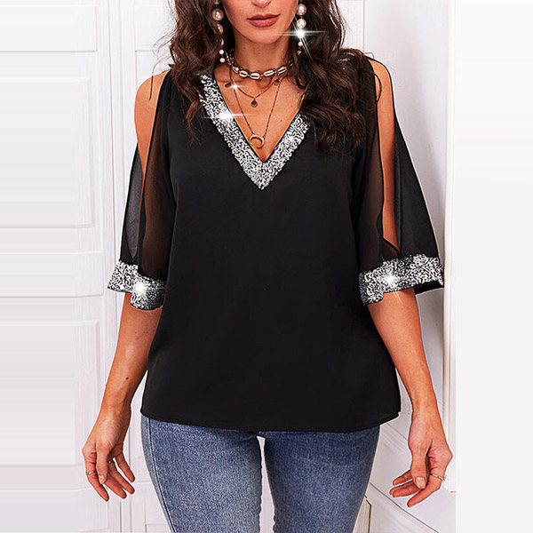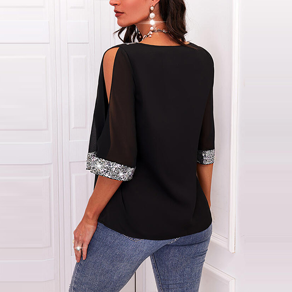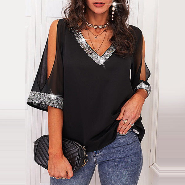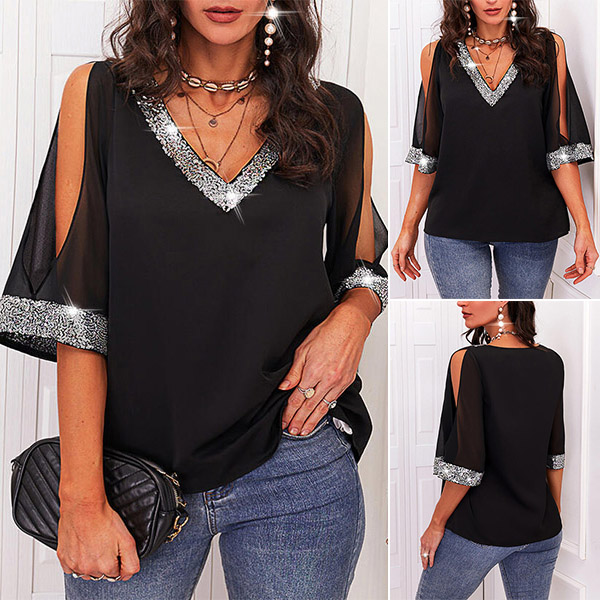 Compared with your other t-shirts,this one can offer you a more fashionable look. The oblique shoulder and sequin spliced details make this piece look so sexy and attractive,while its soft fabric and loose silhouette design can promise you a comfortable day. Like it? Then invite it to your wardrobe.