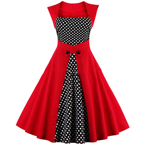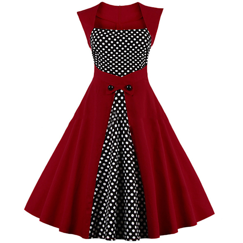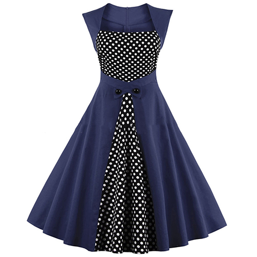 Dots printed spliced style,styled with sleeveless,square collar and a high waistline,this is