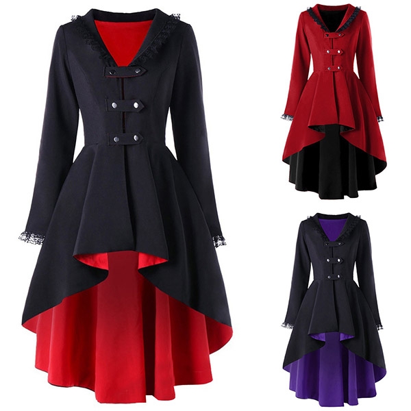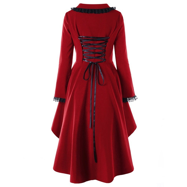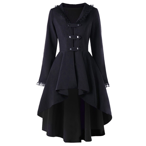 Retro Style Long Sleeve High-low Hem Back Lace-up Lace Spliced Coat