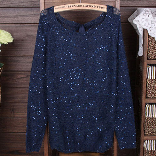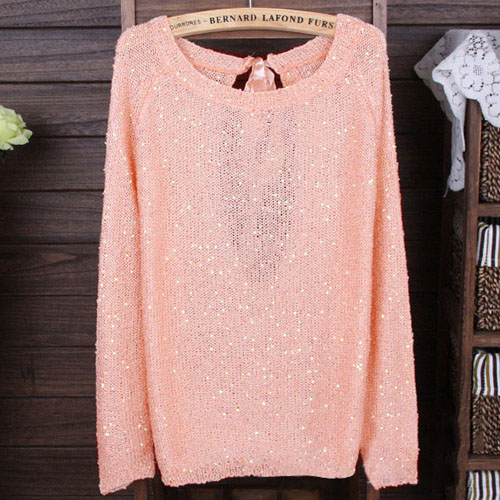 Sexy Backless Bowknot Long Sleeve Round Neck Sequin Knit Tops