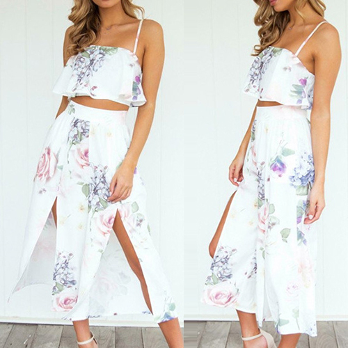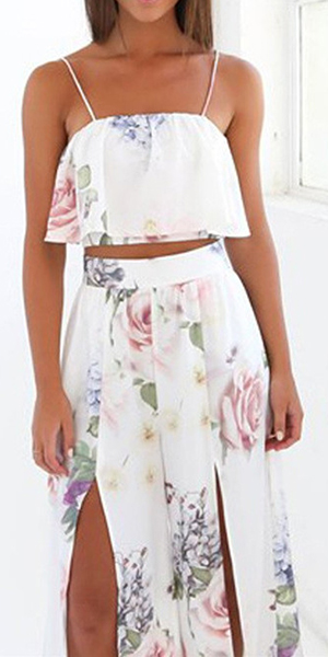 sweet and vibrant floral print,including a backless cami top and a high waist slit hem wide-leg pants,this two-piece
