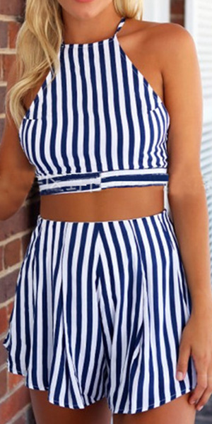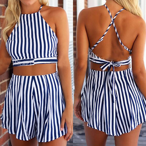 Striped style,including a backless crop tops and a high waist shorts,this two-piece set can give you