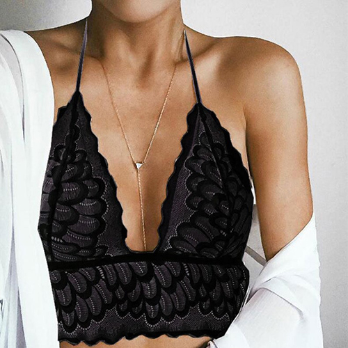 deep v-neck and feather shaped lace details make this piece so alluring.